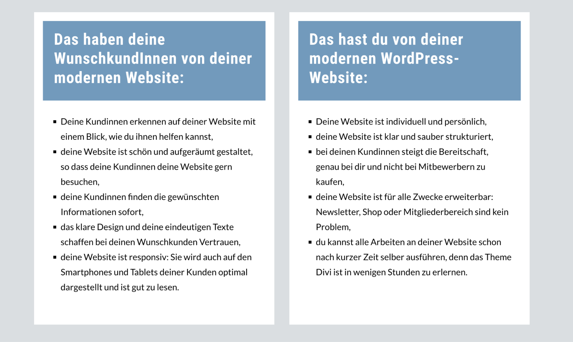 Wann brauchst du es in Divi wirklich? In den meisten Fällen gar nicht – Divi deckt das Wichtigste über seine Einstellungen ab. CSS wird sinnvoll, wenn du zum Beispiel eigene Listenpunkte (Icons statt Standard-Bullets) gestalten möchtest, wenn du ein Element auf allen Seiten gleichzeitig verändern willst ohne jedes Modul einzeln anzufassen, oder wenn du sehr feine typografische Anpassungen brauchst, die Divi nicht anbietet.