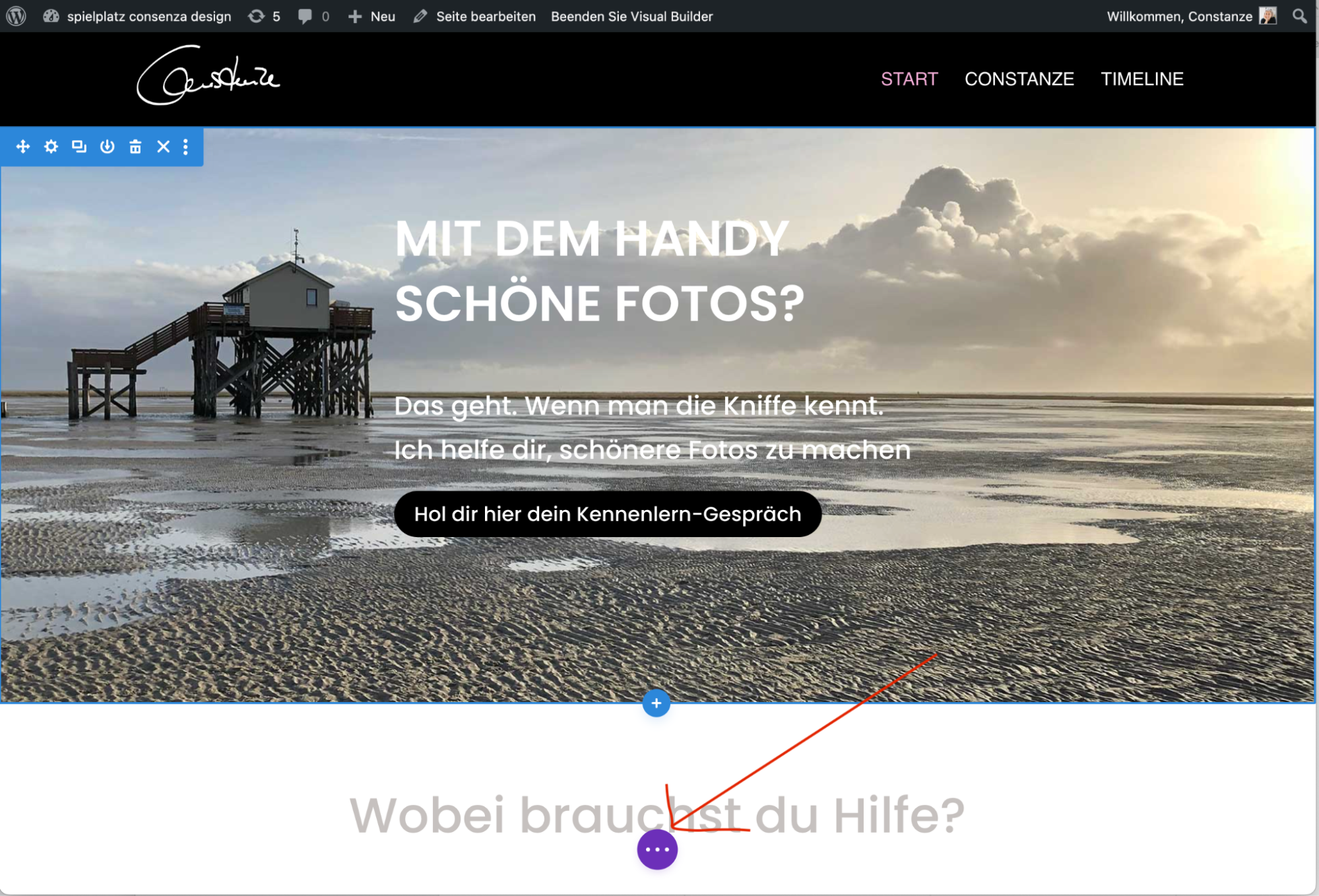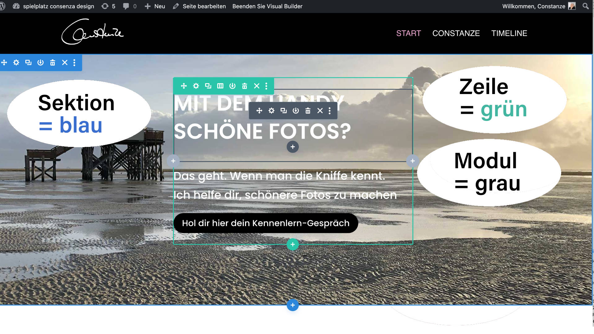 Wenn du weiß, welches Element du bearbeiten möchtest, kannst du direkt die Balken anklicken. Auch so öffnen sich die Editorfenster der jeweiligen Elemente (Sektionen, Zeilen oder Module).