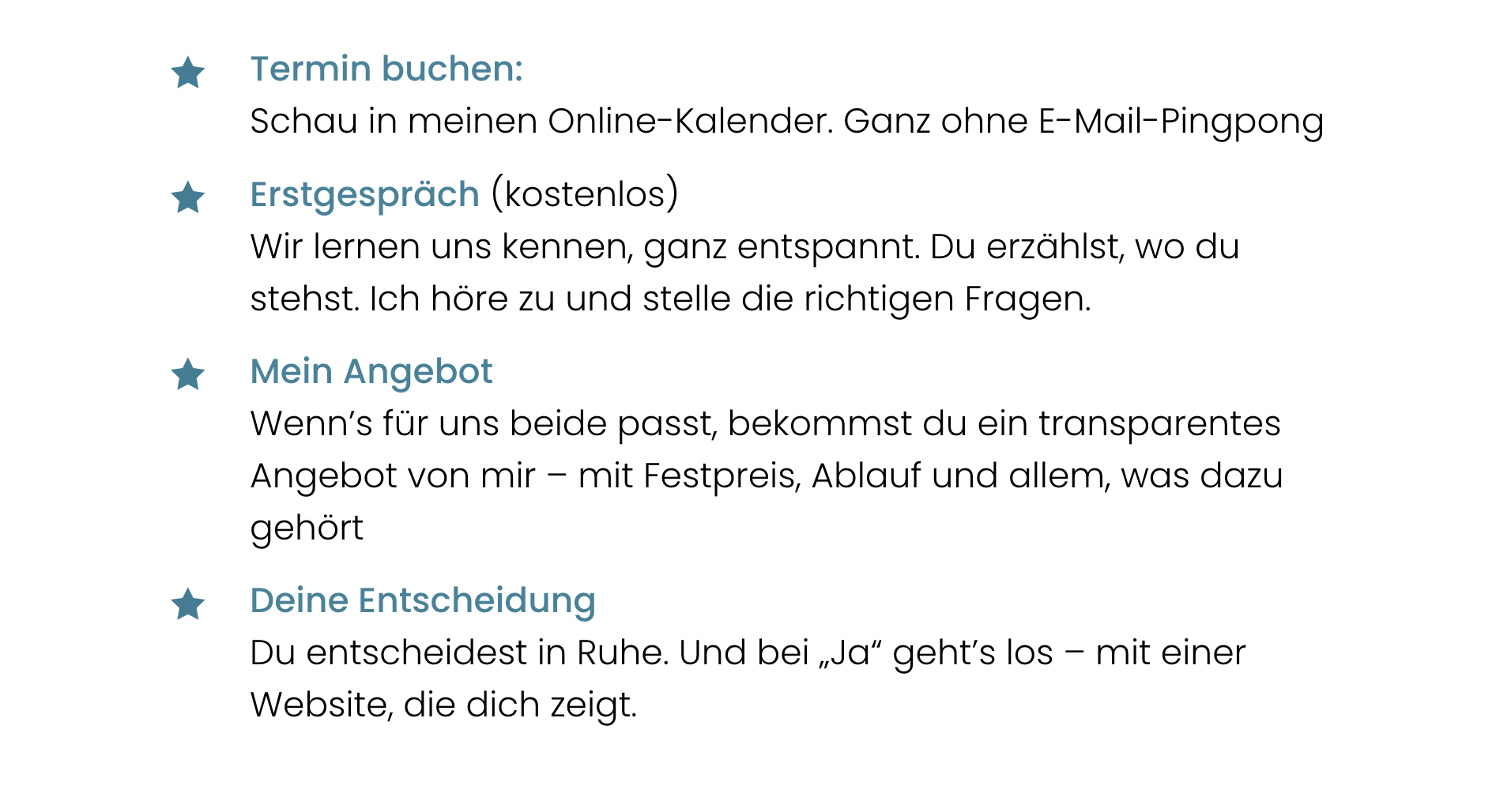 /* Schöne Liste – nur für Listen mit Klasse .schoene-liste */ .schoene-liste { list-style: none; /* native Bullets aus */ margin: 0; padding: 0; /* Grundreset */ } .schoene-liste li { position: relative; padding-left: 1.8em; /* Platz für das Icon links */ margin-bottom: 0.5em; /* Abstand zwischen Punkten */ line-height: 1.8; /* extra Leseluft (ergänzt Divi-Einstellung) */ } .schoene-liste li::before { content: "\e033"; /* ETmodules Stern (Beispiel) */ font-family: 'ETmodules'; position: absolute; left: 0; top: 0.15em; /* vertikal minimal justieren */ font-size: 1em; /* Icon-Größe = Textgröße */ color: currentColor; /* Icon übernimmt Textfarbe */ /* Optional: eigene Farbe, z. B. Mustard: color: #d6a300 */ } |